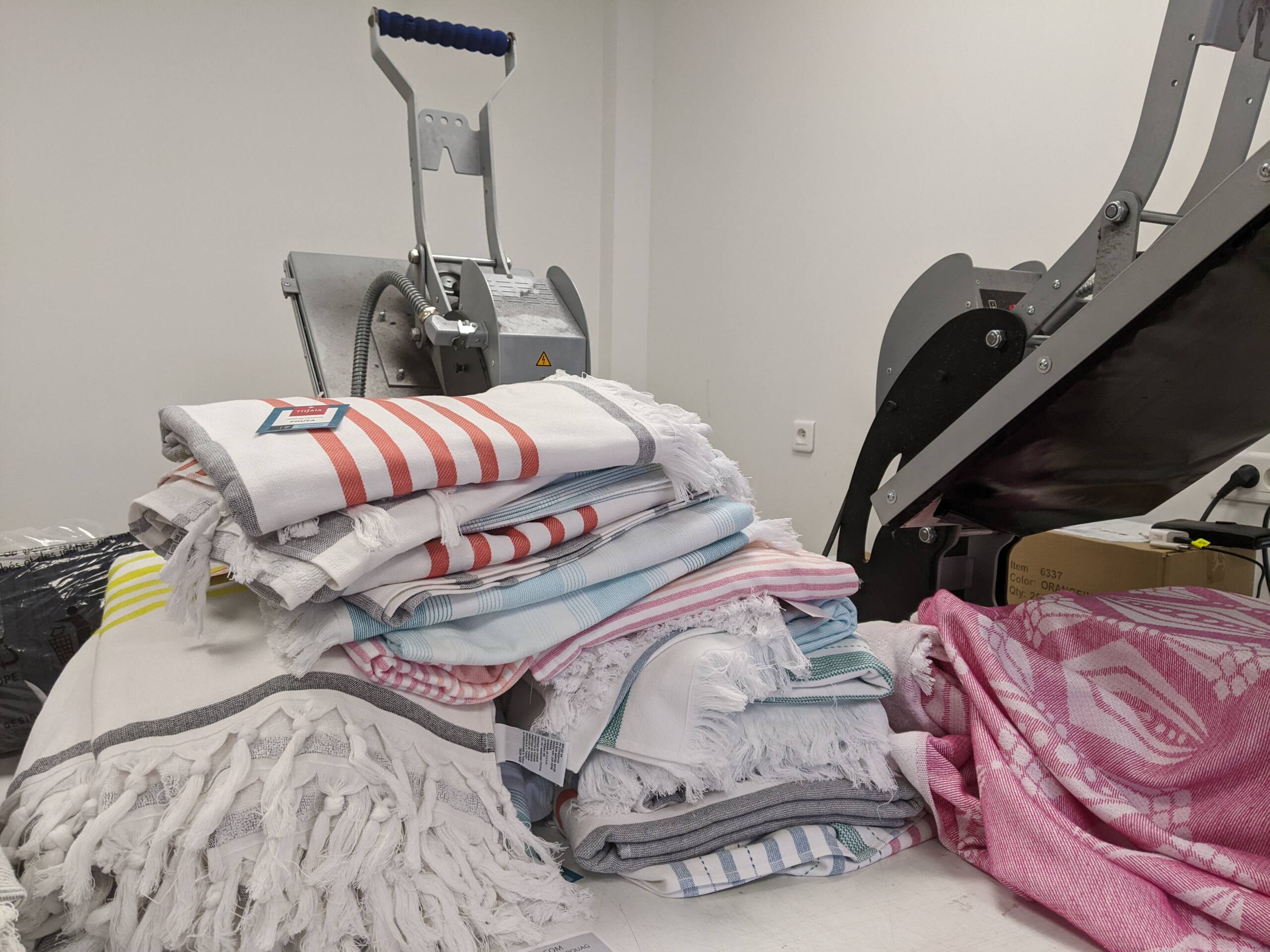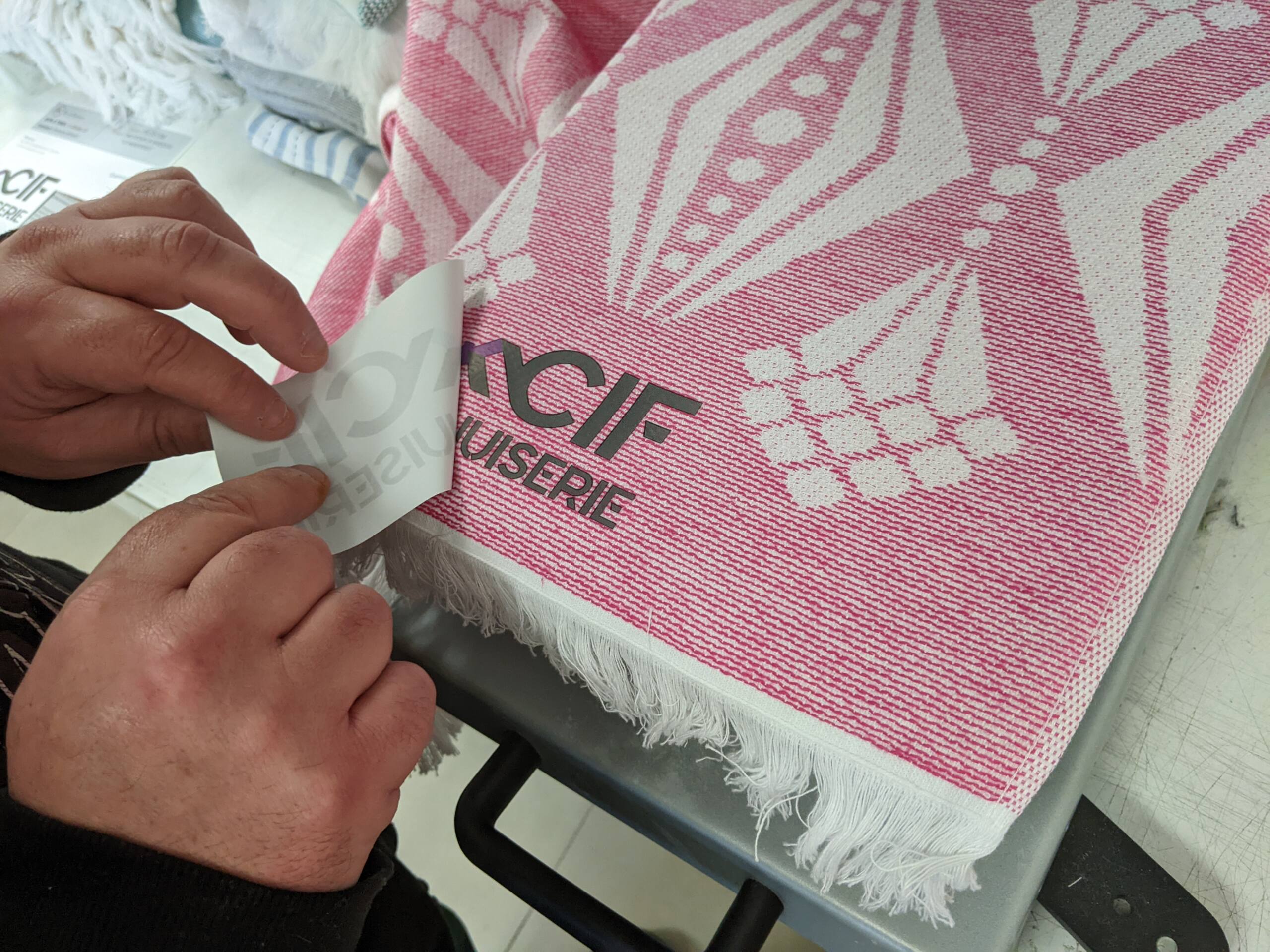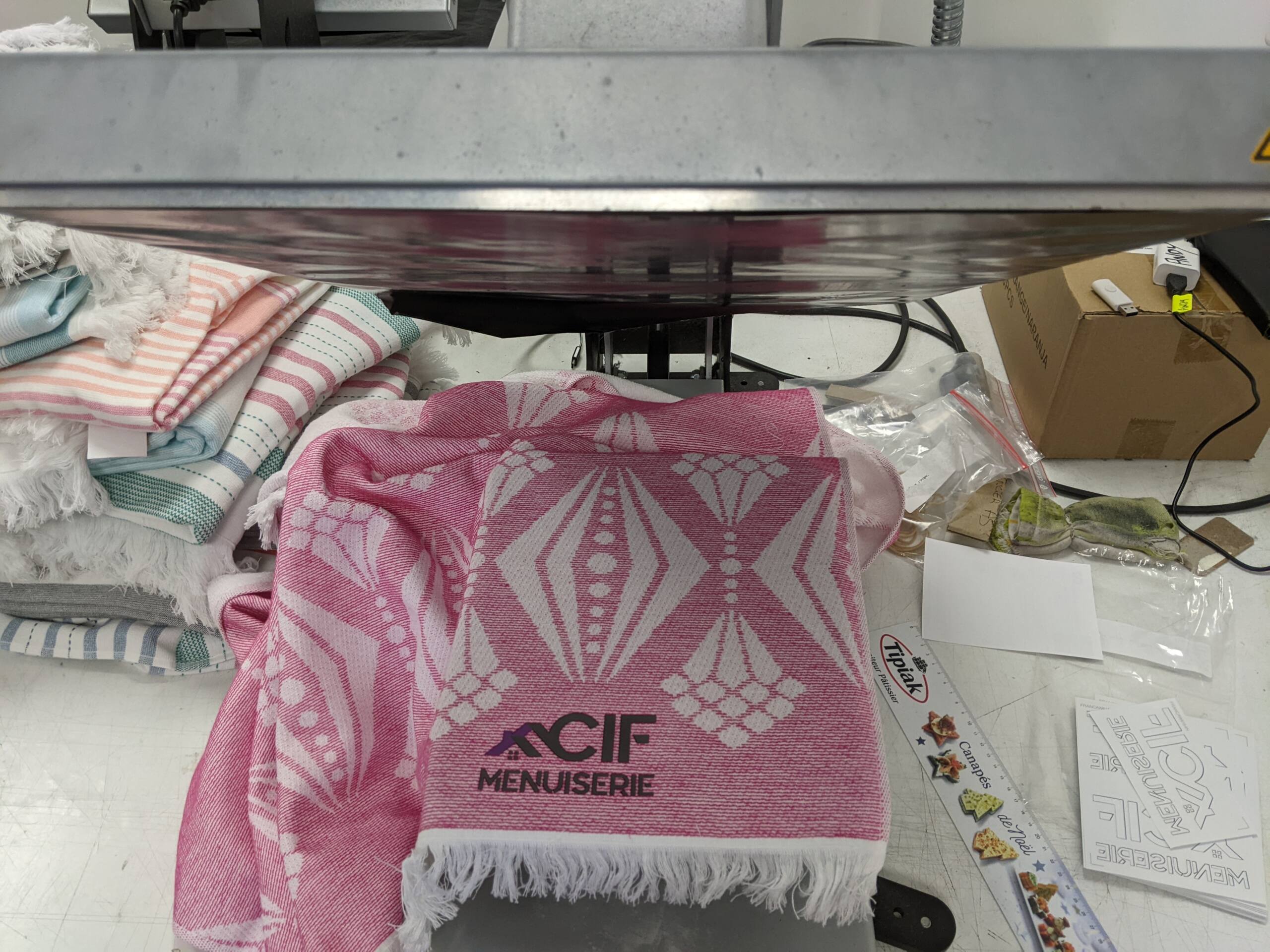 Pour faire des cadeaux d’entreprise personnalisés, CIF Menuiserie a choisi de faire apposer son logo sur des foutas. Une opportunité lui a permis de trouver un stock de bons produits à petit prix, nous avons donc assuré le marquage par transfert sérigraphique sur des textiles fournis par le client.