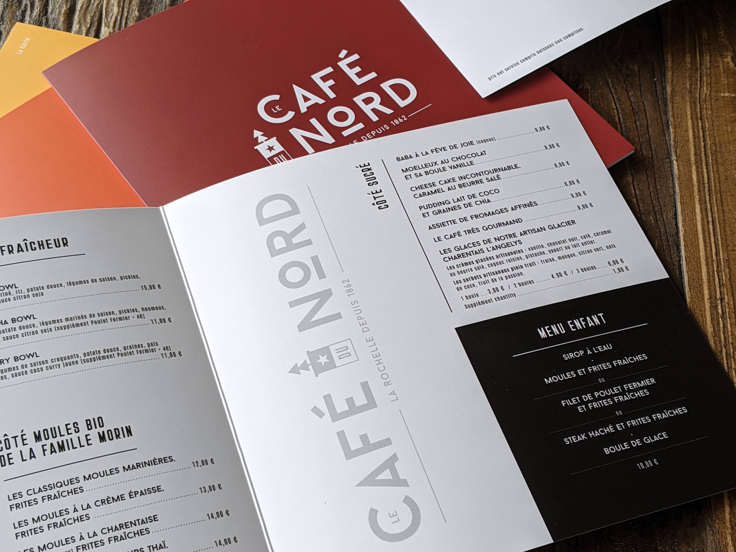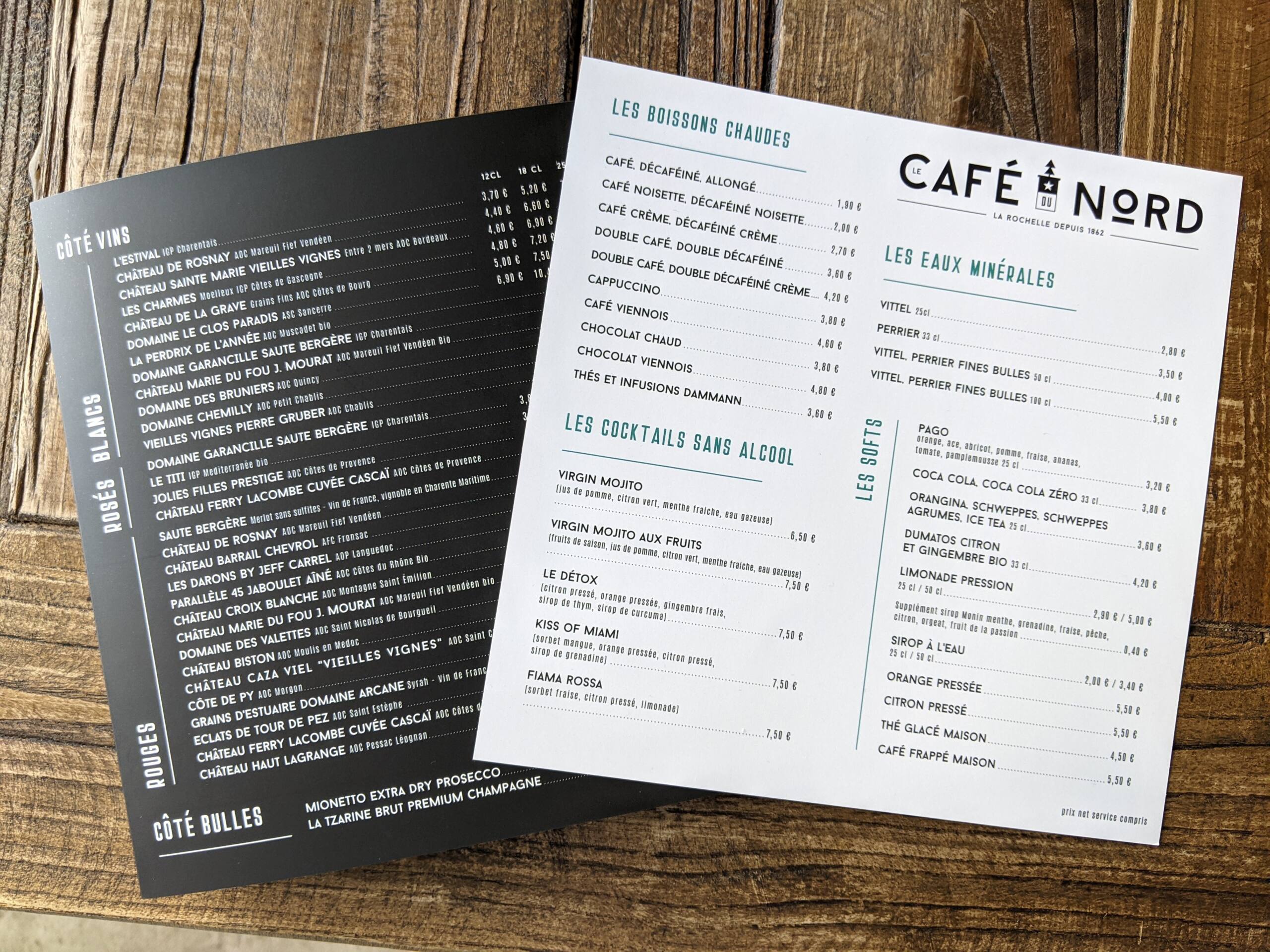 Le Café du Nord est un restaurant qui compte à la Rochelle. Installé dans la plus vieille bâtisse (1862) de du Gabut, quartier réhabilité dans les années 80. En plus d’aimer y manger, notre agence aime collaborer avec son équipe (site internet, carte menu, étiquette, etc.)