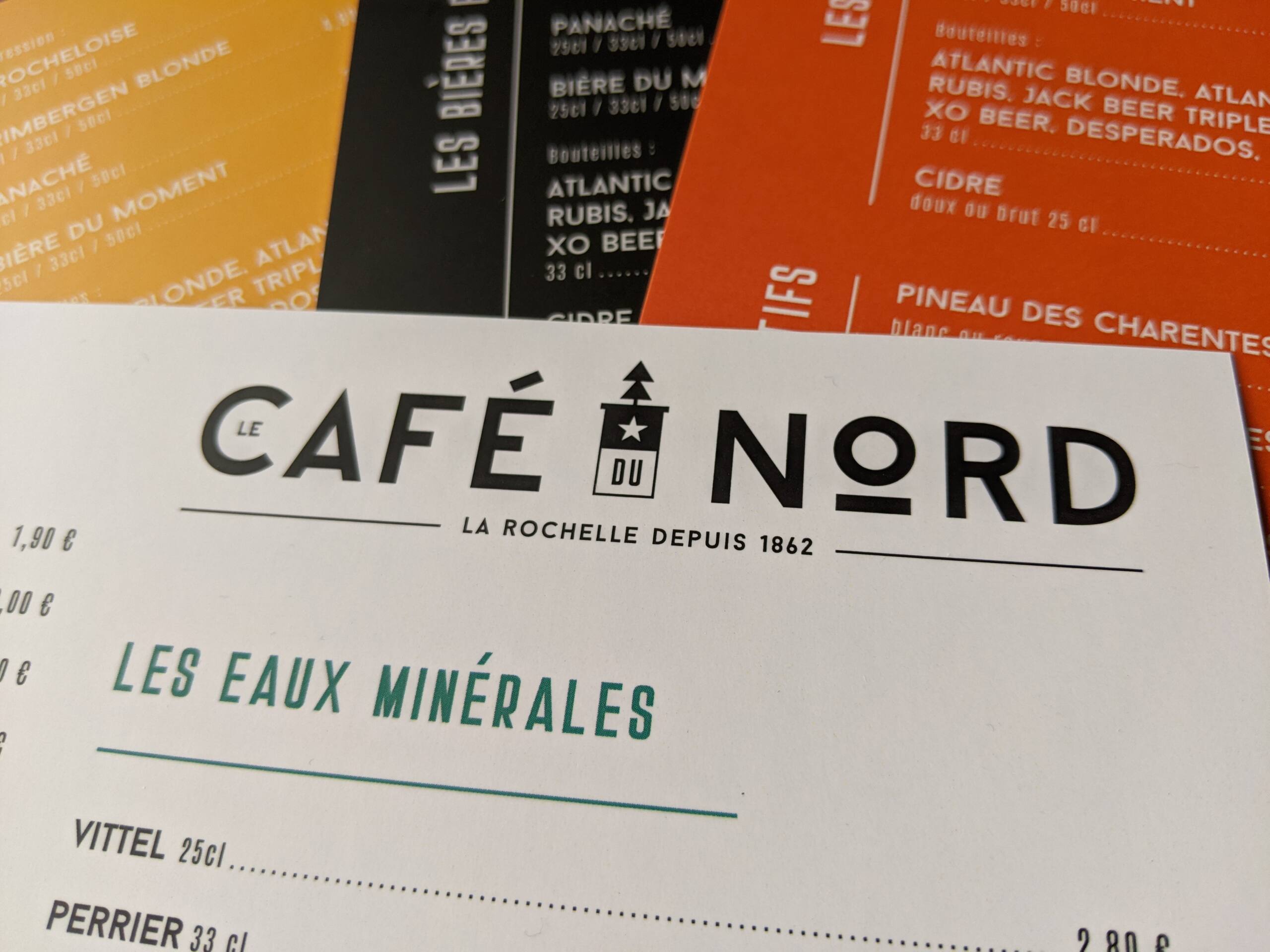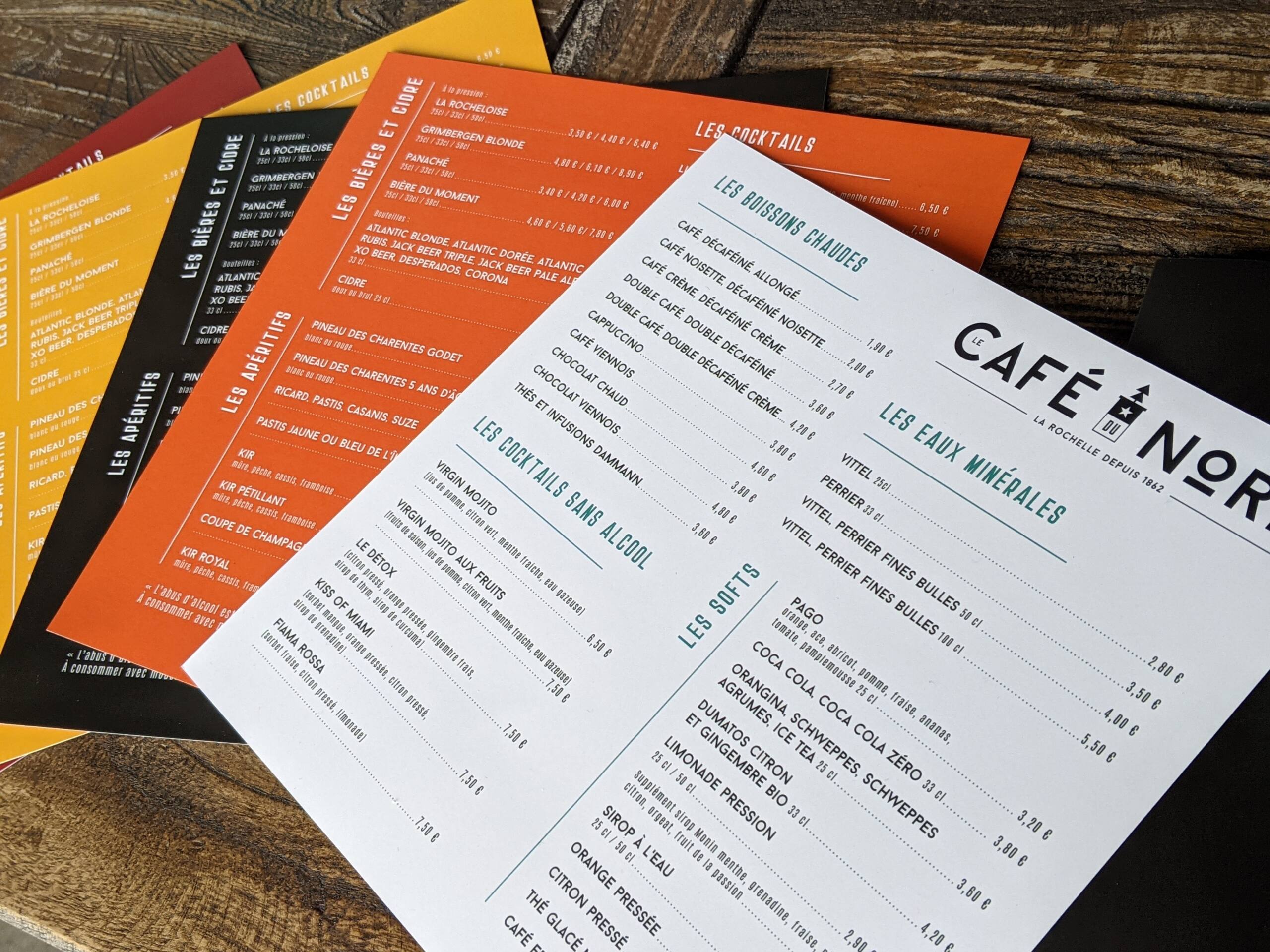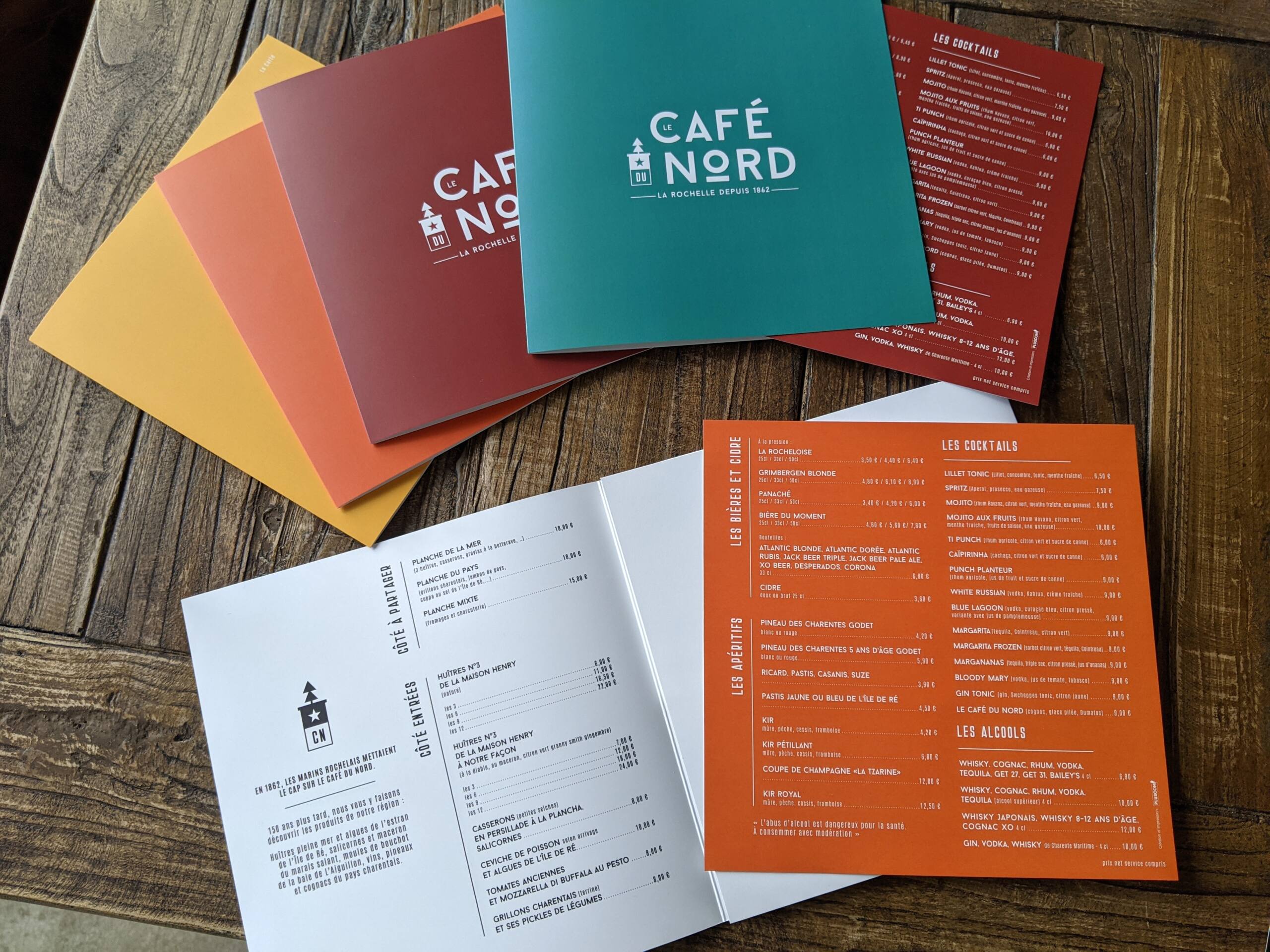 Le Café du Nord change sa carte avant que ne soit lancée la saison touristique 2023. Du coup, Pluscom est chargé de créer un menu complet avec reprise du style graphique.