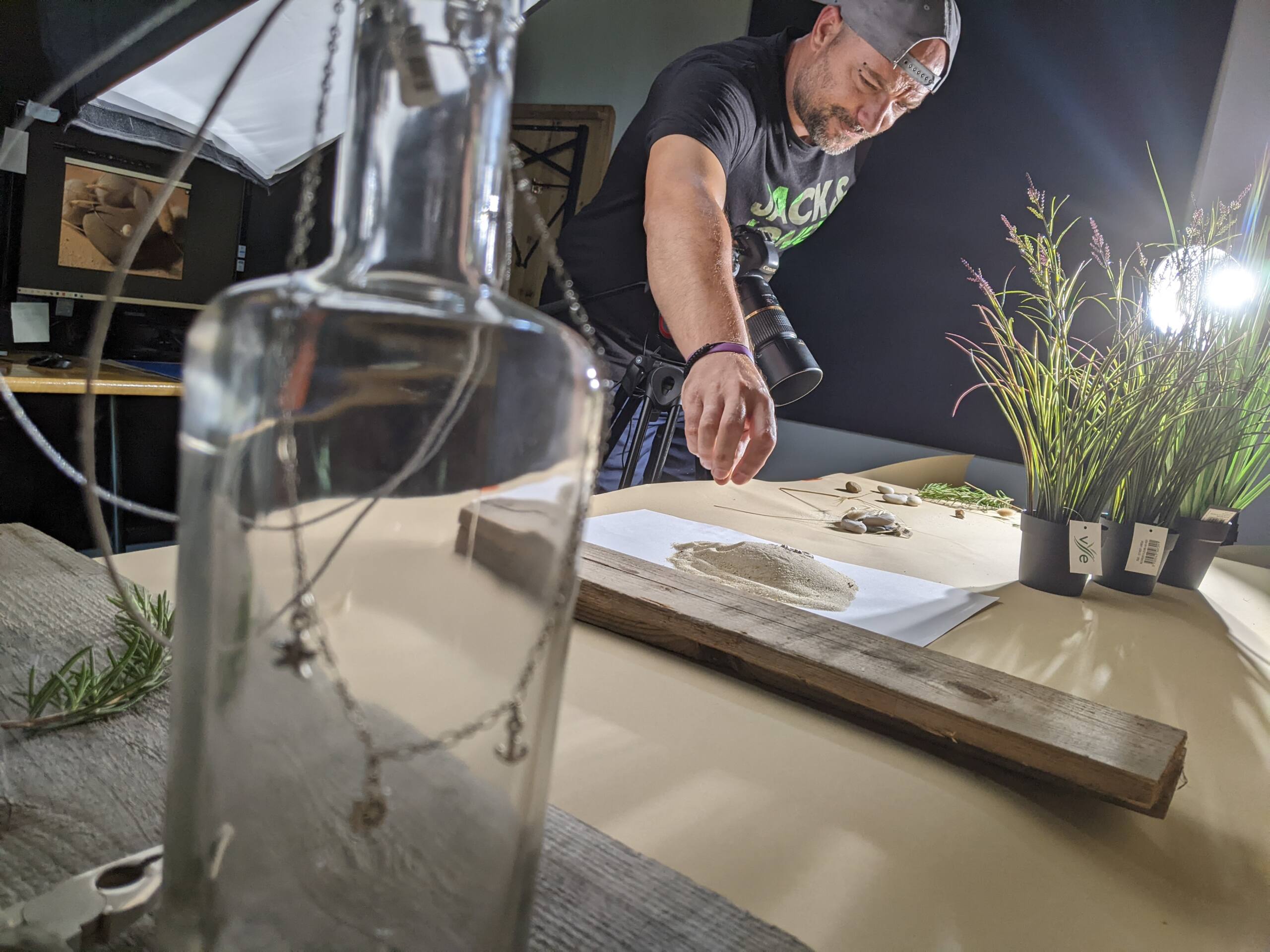 Nos essais de packshot, réalisés dans notre studio, nous ont permis de rédiger un guide pour que le client puisse reproduire les mises en scènes dans son propre studio sur Oléron.